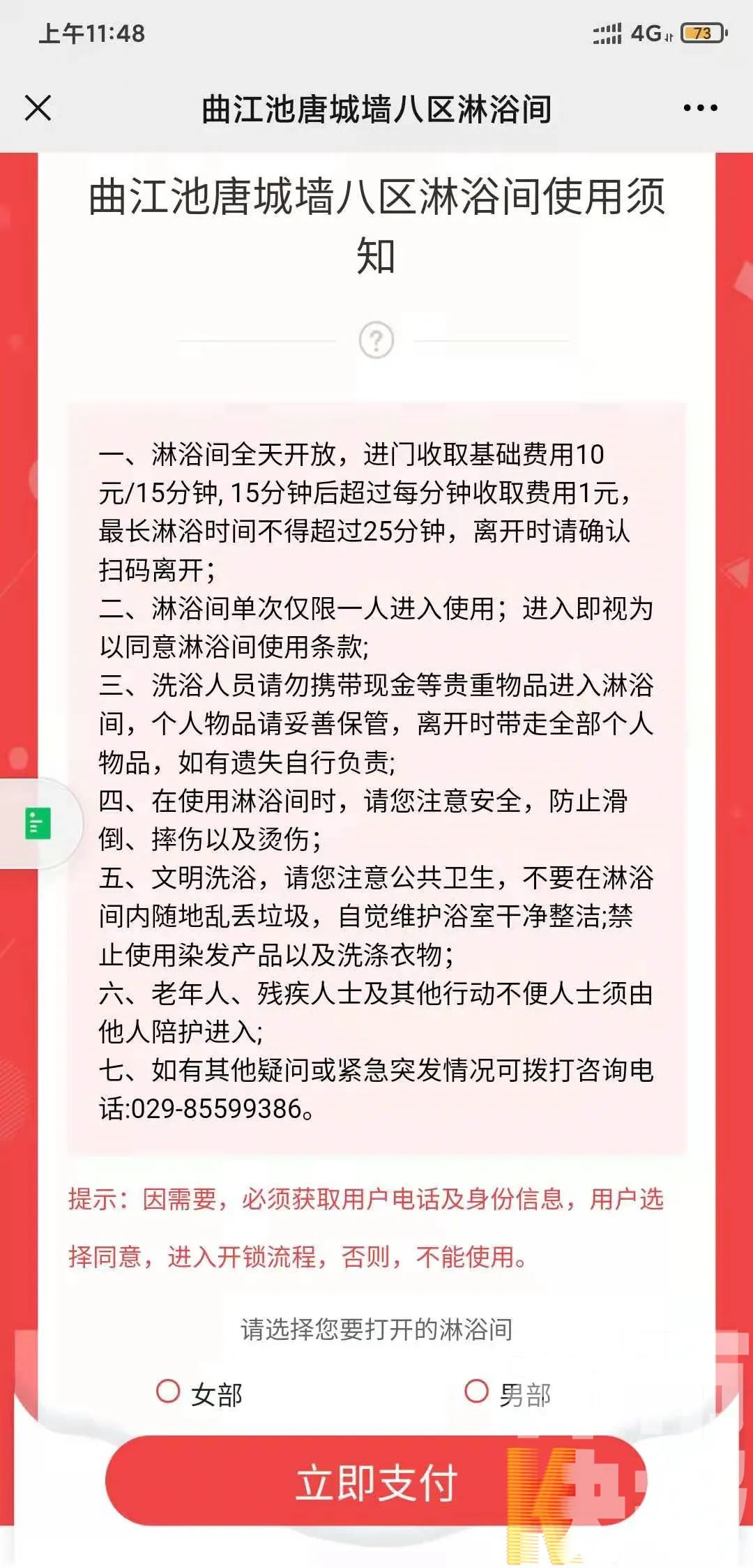 曲江池遺址公園工作人員田睿:“因為整個公園它是以運動為主的,經(jīng)常在這邊有打球的市民游客,為了讓他們一個更好的游園體驗,在這個城市服務(wù)驛站里面增加了淋浴功能。整個淋浴房分為男浴和女浴,男女浴室各有兩間。操作方法也非常簡單,只需微信掃描二維碼進(jìn)出,然后確認(rèn)信息就可以正常使用了。”